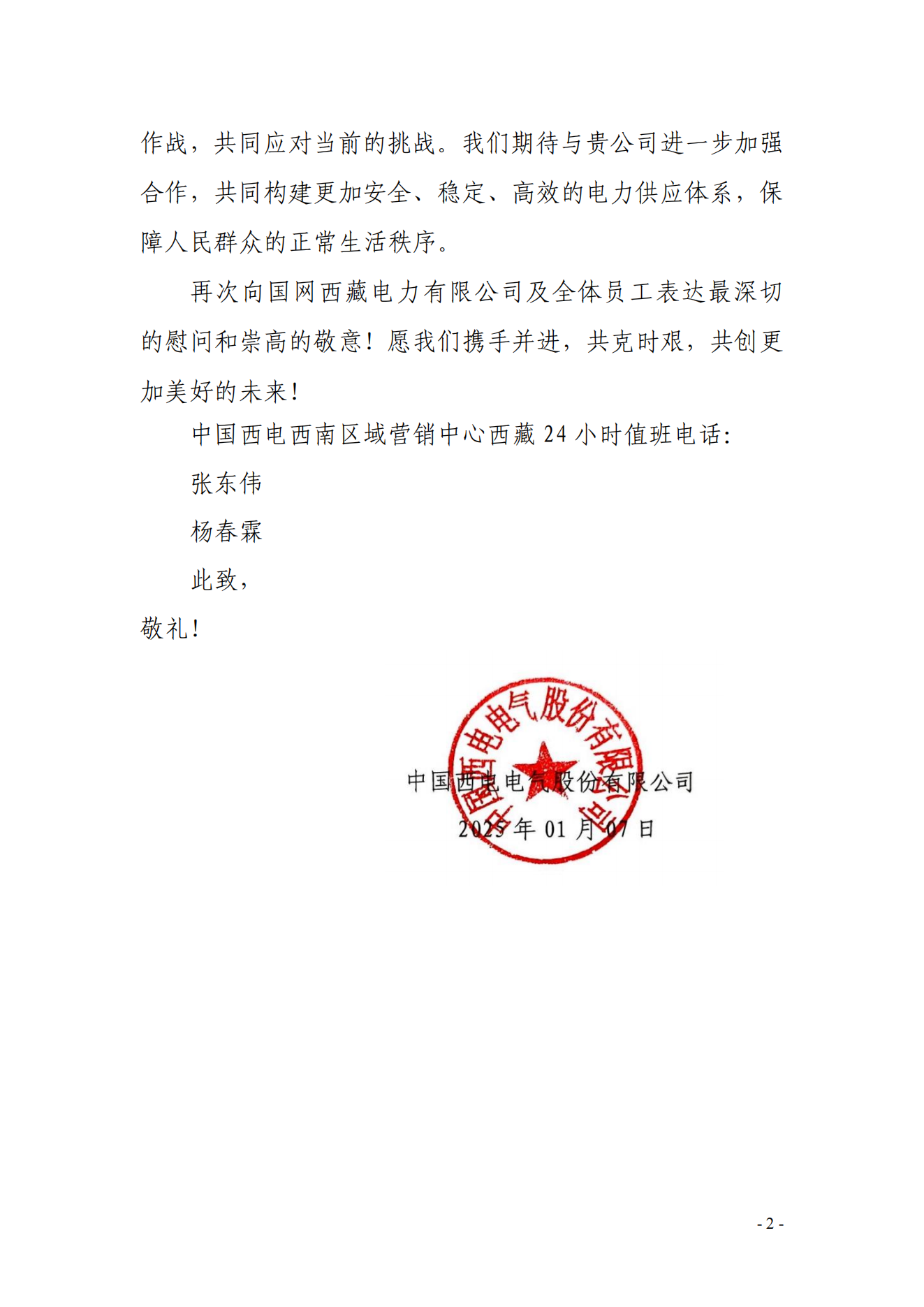 1月9日,市场部西南区域营销中心接到了来自西藏电力有限公司的紧急求助——需要协助筹集50台发电机用于灾区临时供电。接到通知后,西南区域营销中心工作人员迅速行动,立即将情况上报公司。在公司党委统一调度指挥与西开有限的协助和支持下,仅用1天时间便筹集到了56台发电机,在确保运输安全的前提下,运输人员日夜兼程,于1月11日成功将这批急需的物资送达定日县灾区现场,为灾区人民送去了温暖和希望。